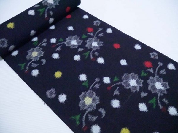 > 【KIRUKIRU】絣着物 反物 12m 着尺 綿 黒地 カラフル花柄 和服 呉服 古布 古裂 襤褸 生地 材料 リメイク 人形細工 ハンドメイド 手芸