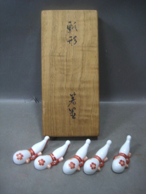 - ☆☆経年未使用保管品 十四代 酒井田柿右衛門 瓢形 箸置き 5客セット 共箱 桜散文