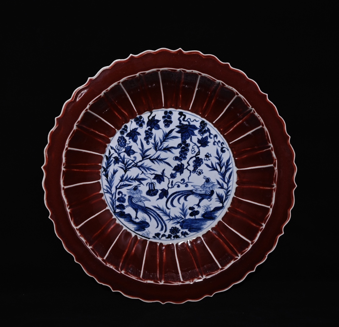 - 9+GV9216「東洋美術」 中国骨董 人間国宝 磁器製品【赤釉青白花鳥文様鑑賞皿】 旧物 孤品 珍品 陶磁器 収蔵価値が高い