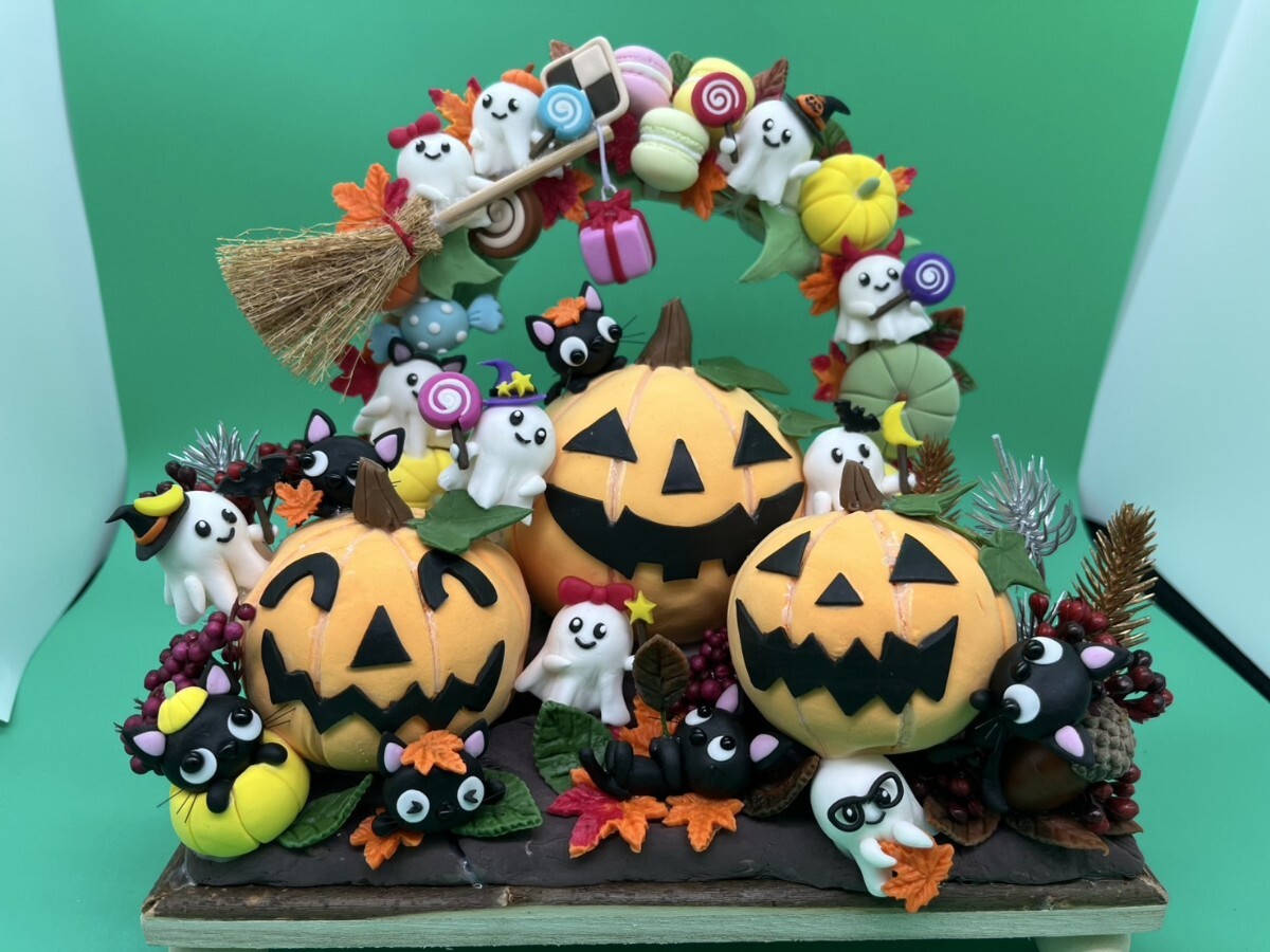 - 樹脂粘土〜ハンドメイド ハロウィン おばけ ネコ ハロウィンリース かぼちゃ LEDライト