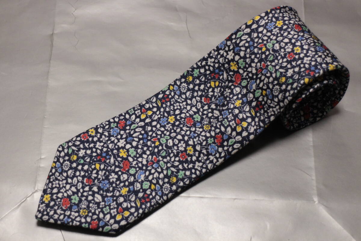 - ドレイクス*阪急新品ネクタイ超華麗モダンネイビー*ホワイト基調マルチカラー花小紋極上リネン混シルクフルハンドメイド