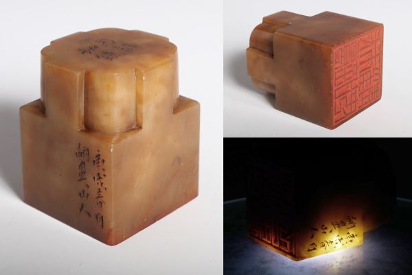 - N26116 中国美術 寿山石 黄芙石 方柱形印 107g 印材 書道具 文房具 田黄 中国 古玩 唐物