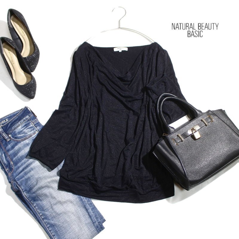 - 美品 ナチュラルビューティーベーシック NATURAL BEAUTY BASIC 秋 合物 ドレープネック 8分丈 ニットカットソー M ブラック 黒 透け ニット