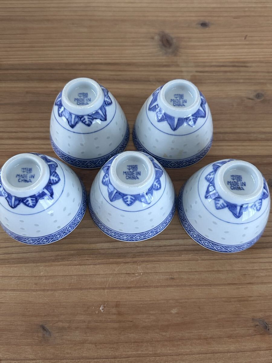- 中国 景徳鎮 蛍手 青花 透かし 湯呑み 5客セット 米粒透かし