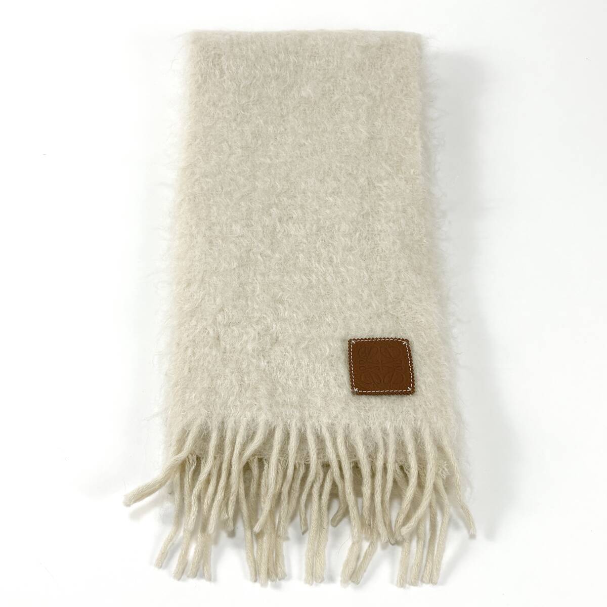 - 極美品 LOEWE / ロエベ スカーフ(モヘア&ウール) F655254X01 ホワイト マフラー ストール フリンジ レザーパッチ レディース SM5191