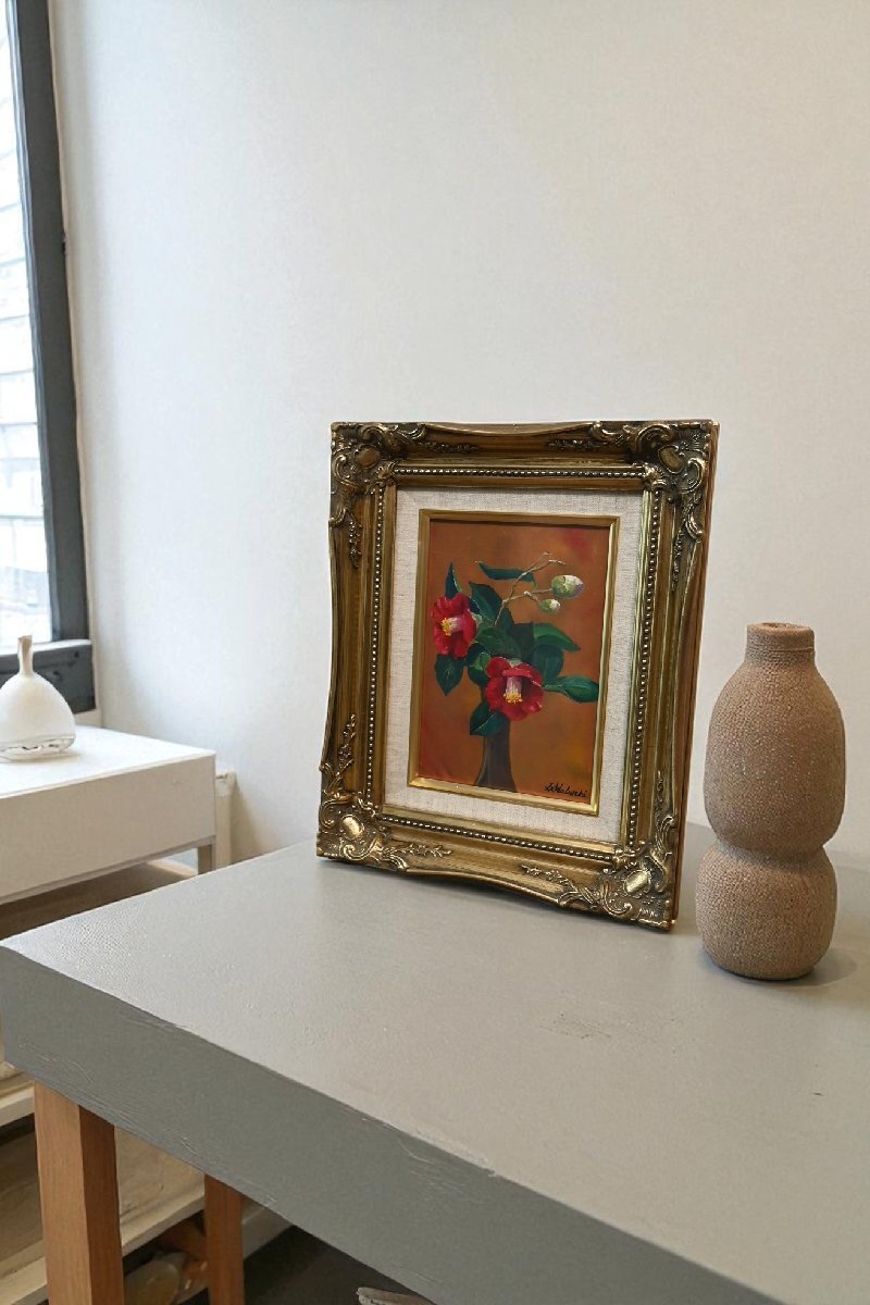 > ○羽渕完俊 油彩画作品 椿 花の絵 豪華な文様柄の木製額 SM号 93年制作 和モダン アート 古道具のgplus広島 2509i