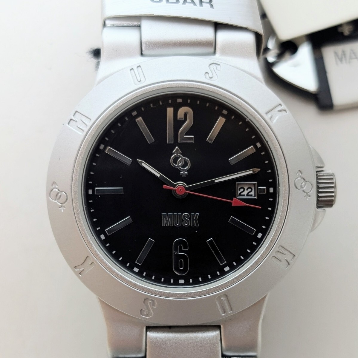 > 未使用保管品 MUSK MA-2175 ムスク クオーツ オールアルミニウム 三針モデル 黒文字盤 デイト 電池交換済み 稼働品 定価68000円