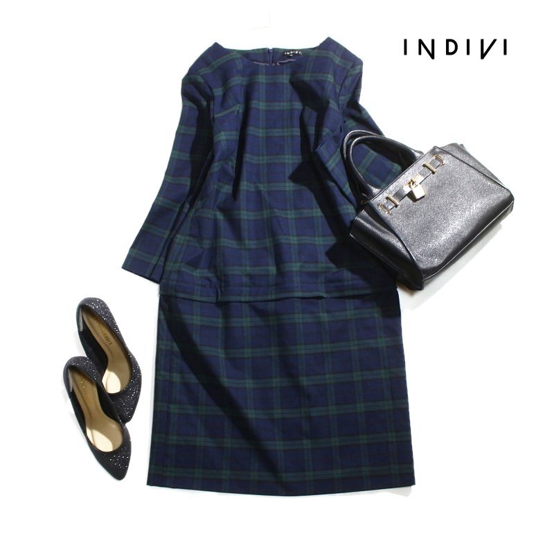 - 美品 インディヴィ INDIVI 株) ワールド 秋 冬 2way タータンチェック 柄 9分袖 ワンピース 9号 38 ネイビー 紺 グリーン 緑