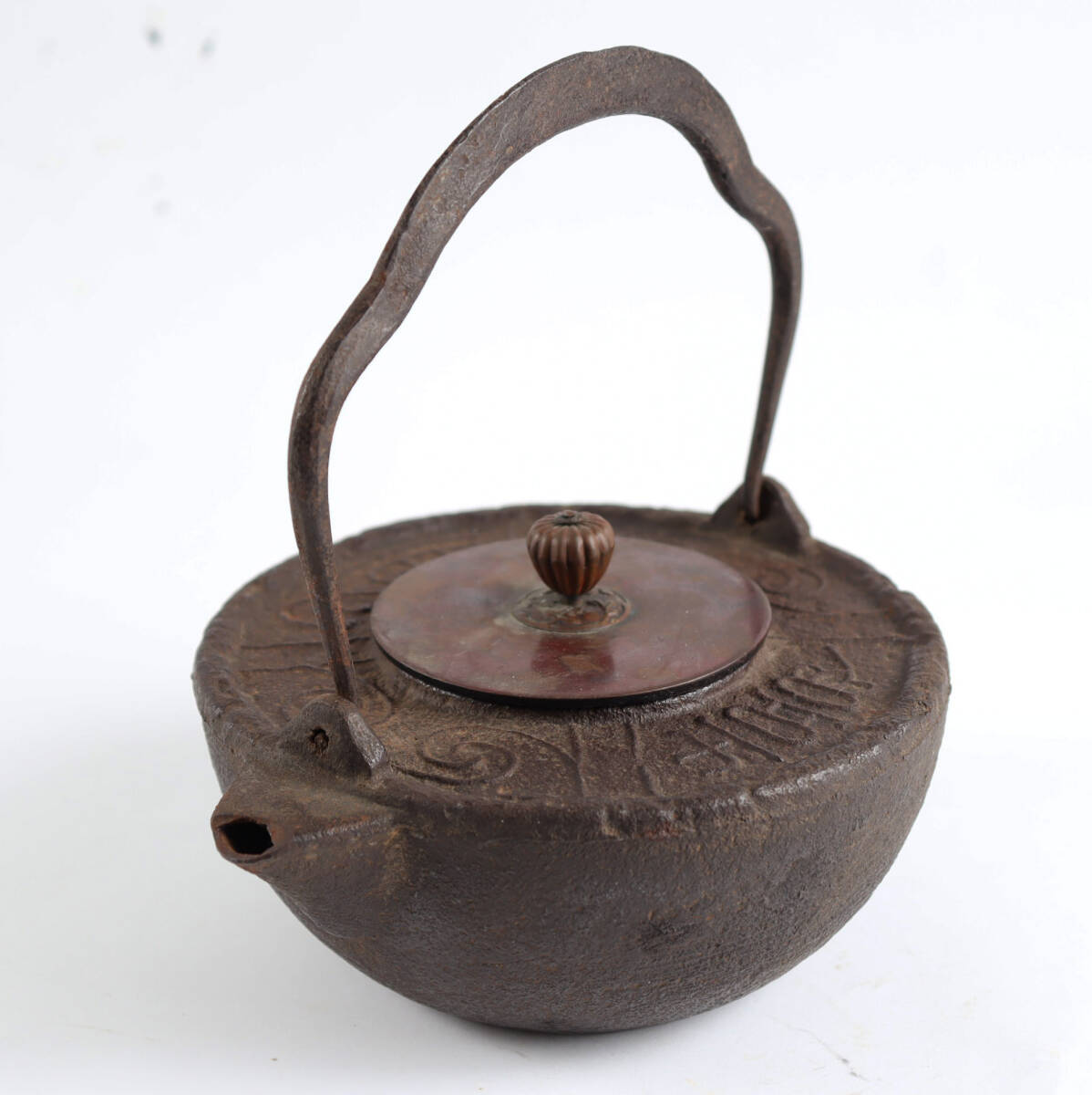 - 釜師名人造 幾何学文 独楽形砲口鉄瓶 精金堂造 銅蓋(忠三寒雉安之介大国龍文堂)E838