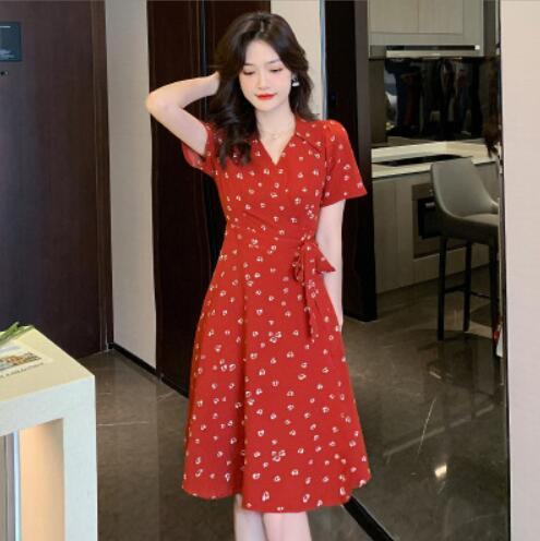 - 人気推薦半袖ワンピース フリル 切り替え バイカラー スリム 着痩せ 【大きいサイズあり】 sweet系 M レッド
