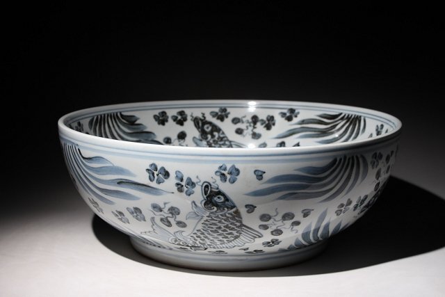 - 特別依頼出品 織田家由来某寺院所蔵 染付大鉢 魚藻紋 直径約40cm (検)青華 唐物 中国美術 古美術品 古玩