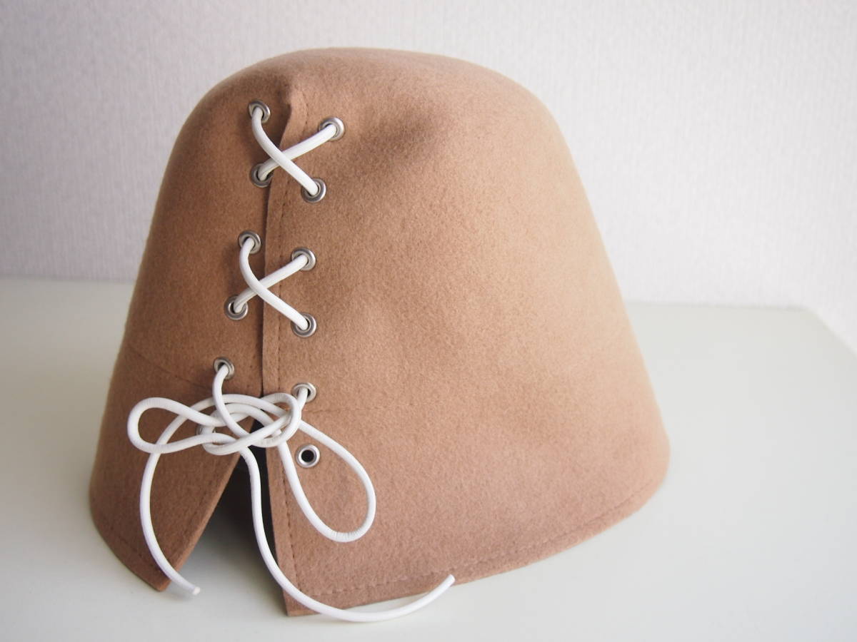 > k135 【新品18,000円】56~60cm 男女兼用 日本製 カミラフカ バケハ バケツハット ベレー帽 帽子 ウールハット ベージュ ハット 編み上げ