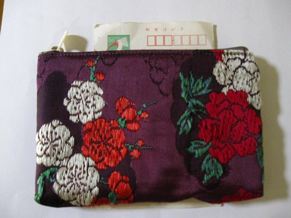 - 手作り 着物リメイク 大 ポーチ 紫 薔薇 菊 花 模様 刺繍 華 古布 帯 レトロ ハンドメイド 小物 充電器 眼鏡 財布 男女 兼用 幅広 パープル