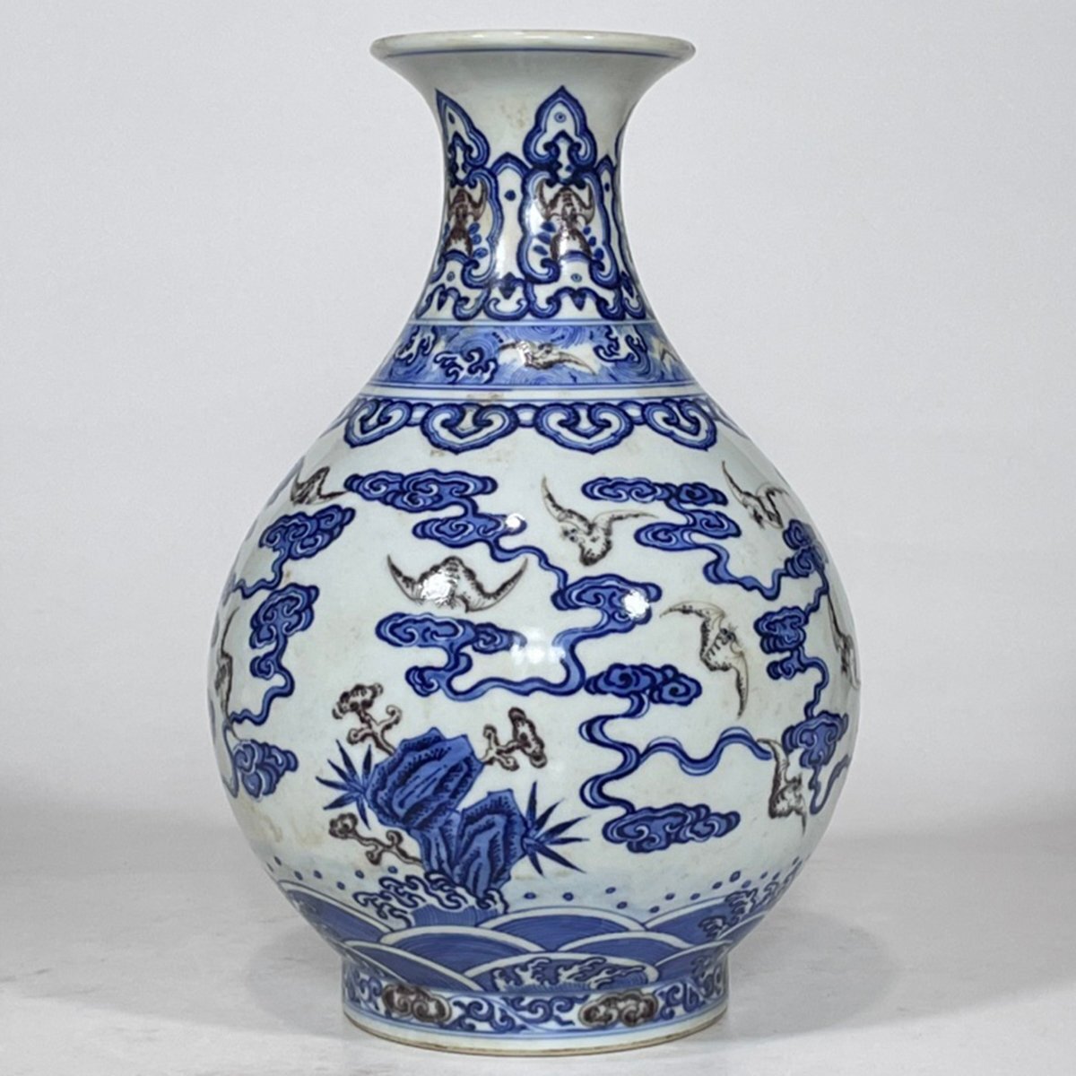 - 【安】清時代 大清乾隆年製 青花釉裡紅蝙蝠如意雲紋玉壺春瓶 共箱 唐瓷 古陶瓷 中国古美術 古董品 240