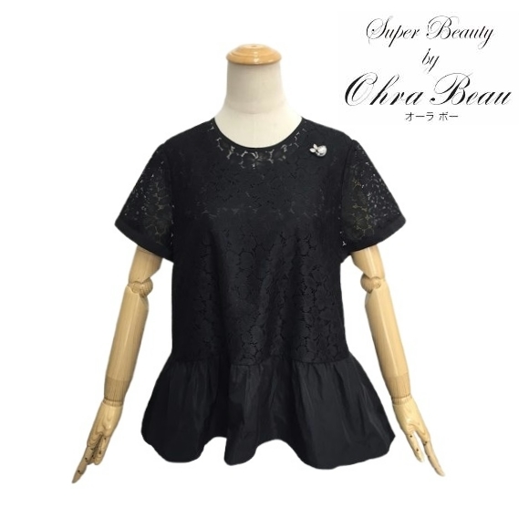 > スーパービューティー 44 カットソー レース 後ろストライプ 半袖ブラウス 2515014 ブラック LL 2025年春夏 オーラボー 大人かわいい服