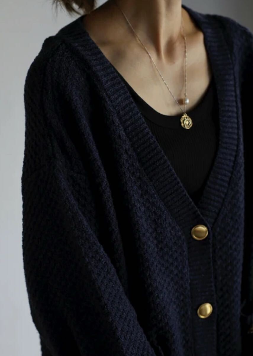 - 新品 金ボタン ツイードライク ニットカーディガン フリーサイズ ネイビー