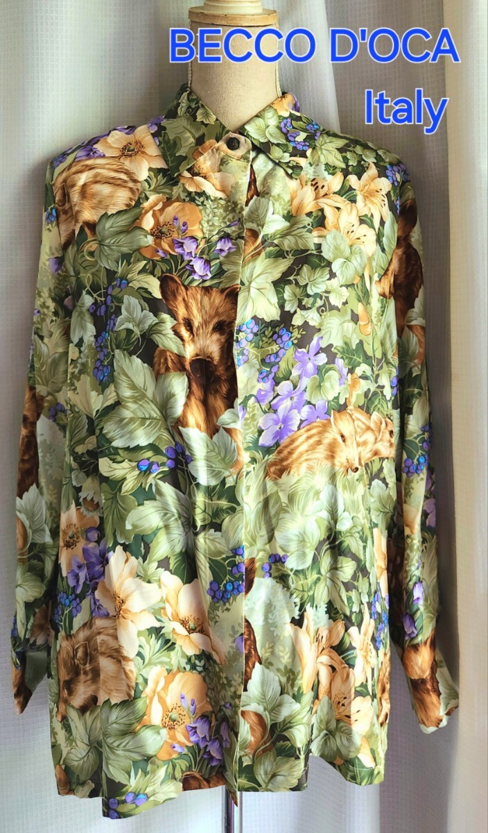 - 大変美品 BECCO DOCA イタリー製 ウリ坊とボタニカル柄 長袖シルクシャツブラウス グリーン系