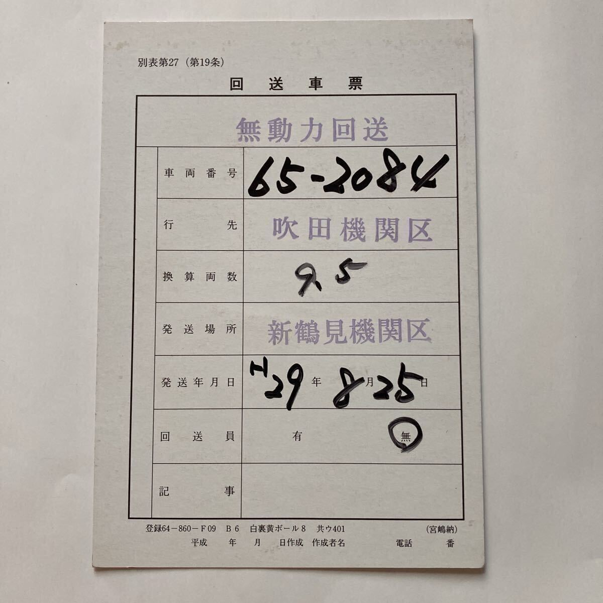 - 【回送車票】EF65ー2084/吹田機関区→新鶴見機関区◆平成29年8月
