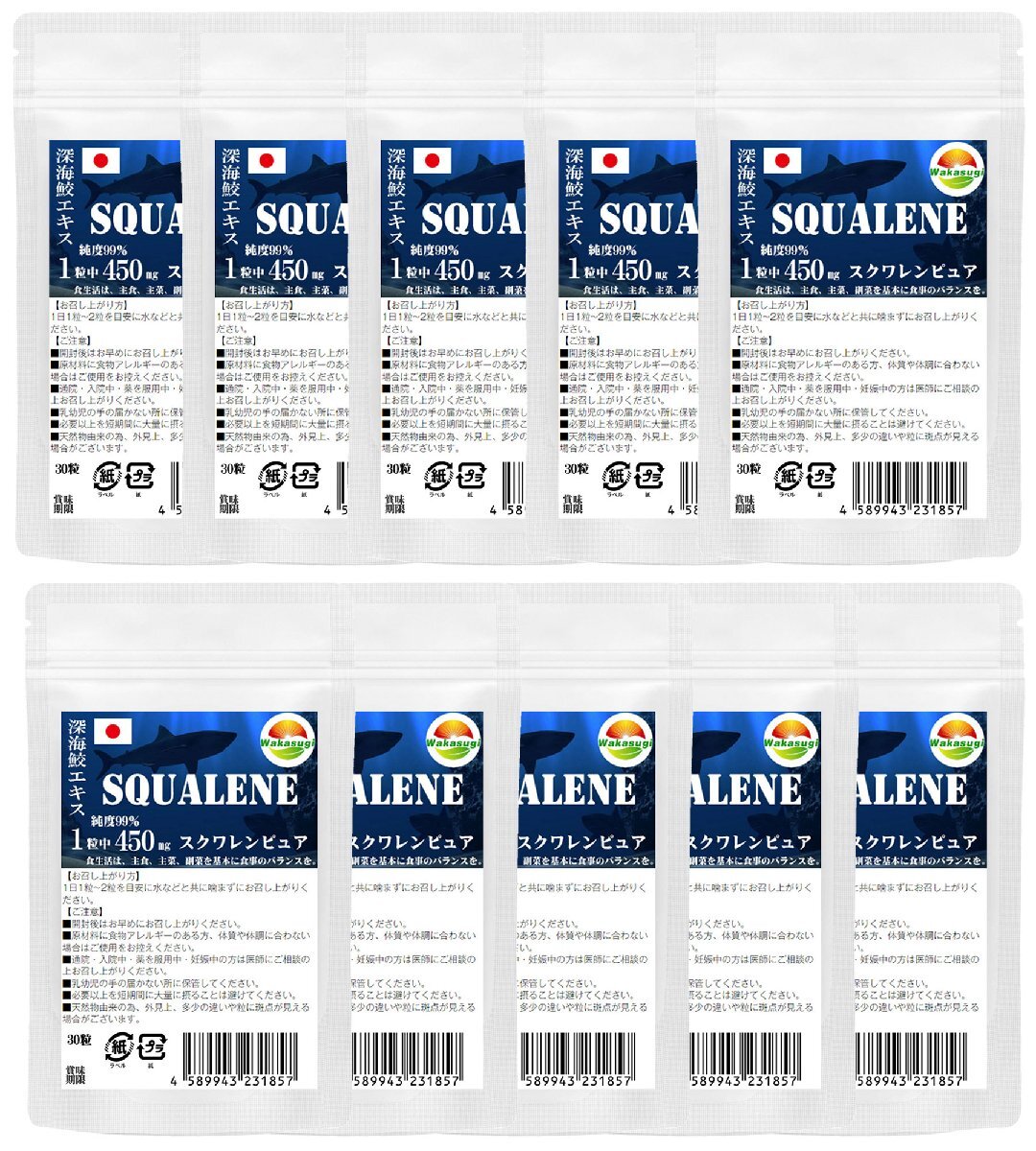> スクワレンピュア30粒 10袋セット計300粒 鮫肝油 純度99% 1粒中 深海鮫エキス 450mg配合 大型ソフトカプセル 長径15mm×直径9mm