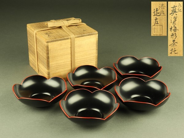 - 【宇】3115 漆匠 川端近左造 爪紅真塗梅形茶托 五客 共箱 煎茶道具