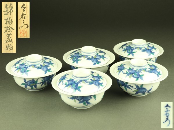- 【宇】3202 今泉今右衛門造 錦 桃絵蓋物 五客 共箱