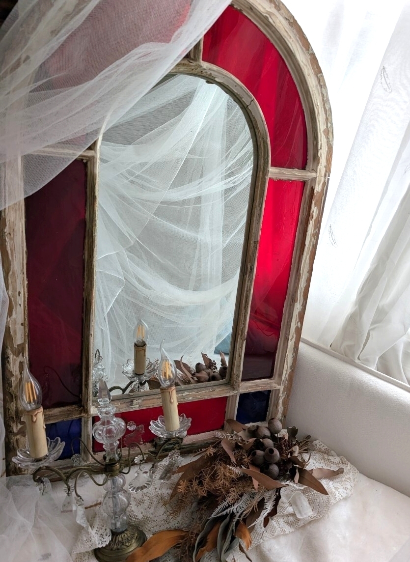 - ◆ 送料無料 !! ◆ フランス アンティーク ドーム型 木製 窓枠 ミラー 鏡 窓 ステンドグラス ディスプレイ / シャビーシック シャビー 什器