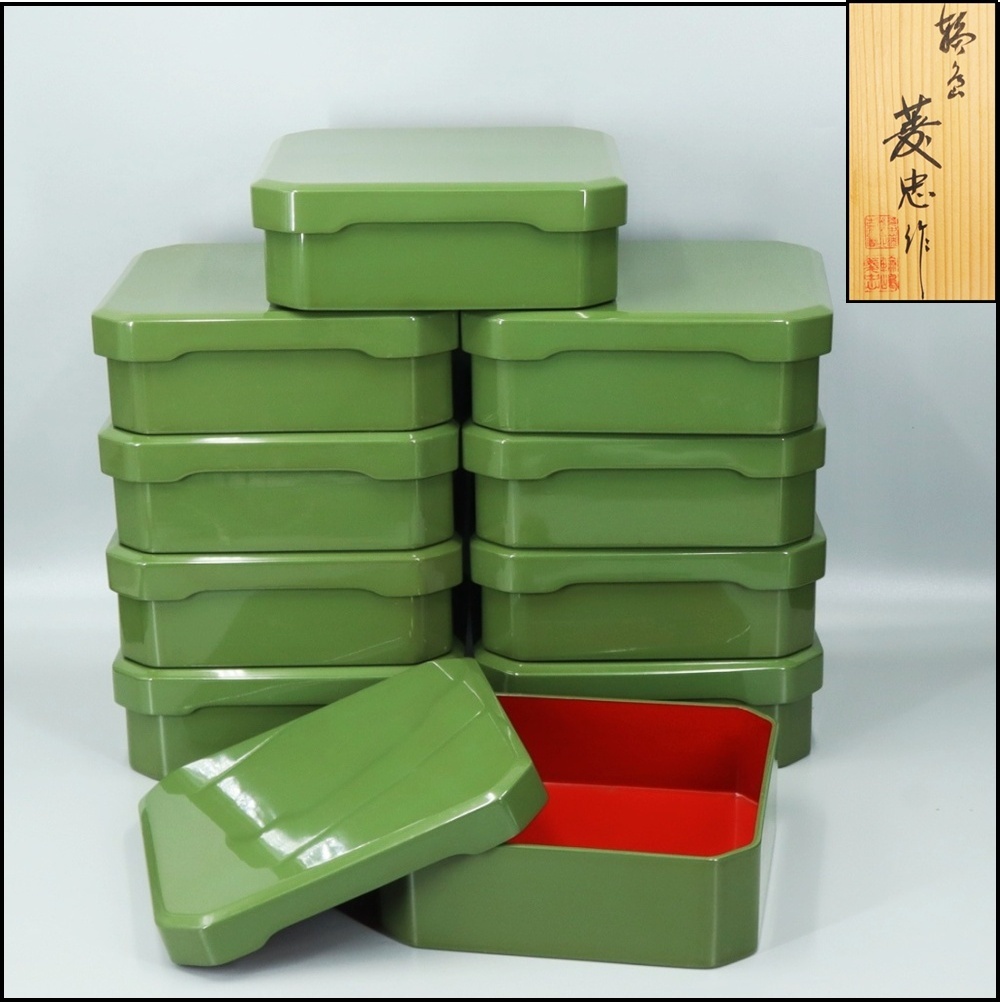 - 【塗師 菱忠 作】輪島塗◇肥古田賓製◇青磁内朱◇大徳寺重◇10客◇共箱◇ 懐石 茶懐石 向付 蓋物碗 銘々皿 茶道具