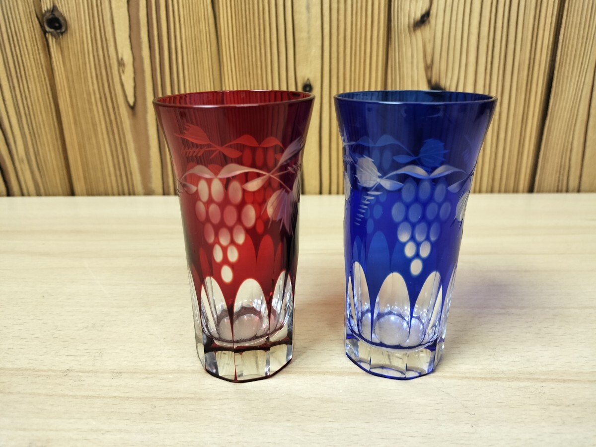 - ★ 江戸切子 粋彩切子 葡萄柄 中金硝子 グラス ビアグラス ブルー レッド ペア★