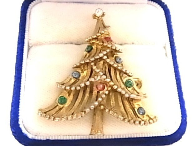 > ビンテージ/ヴィンテージ クリスマスツリーのデザイン マルチカラーfakeストーンとゴールドトーンが煌く Xmas レトロブローチ※
