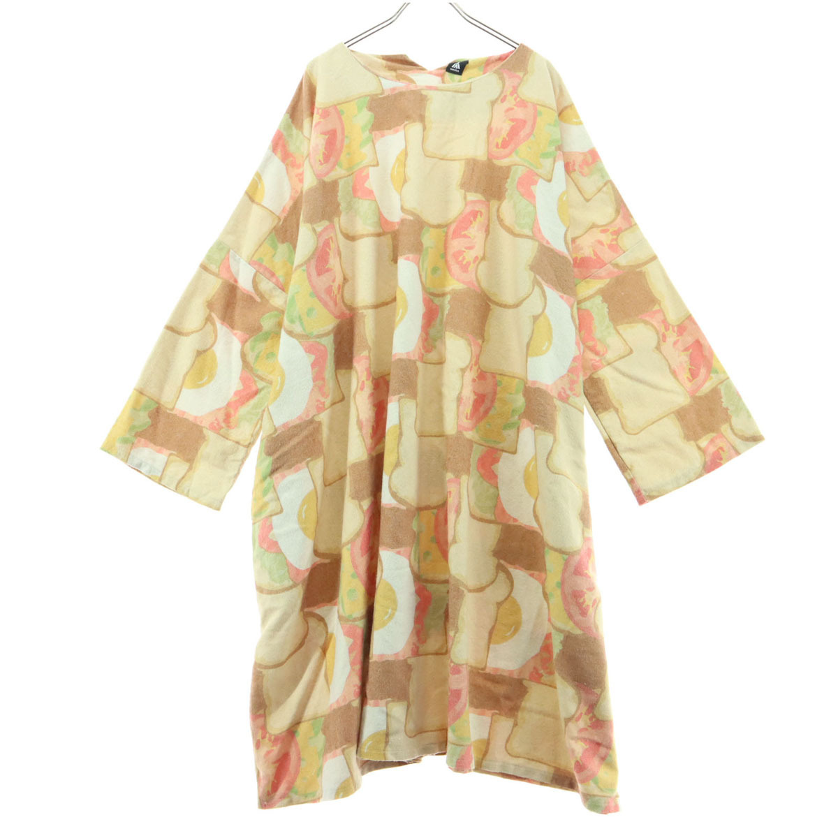 merlot メルロー 朝食柄 長袖 ワイド 膝丈ワンピース オレンジ系 レディース拍卖
