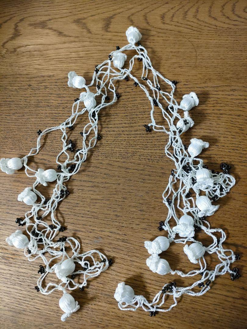 - r5 オヤ刺繍 ラリエット ネックレス 鈴蘭 ホワイト 黒ビーズ トルコ