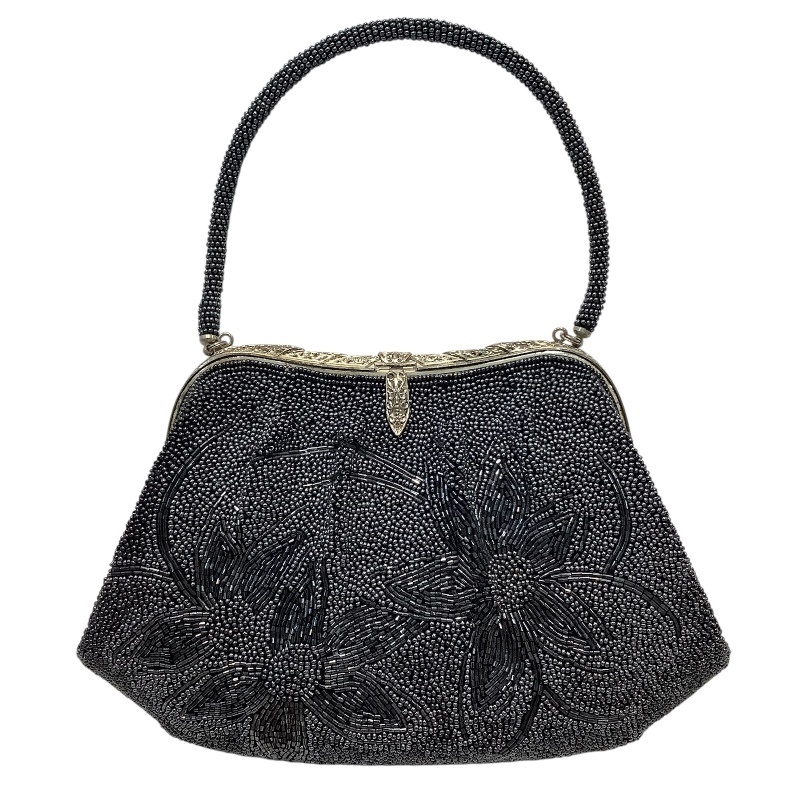 - ビーズ バッグ ブラック ハンドバッグ フォーマルバッグ 花柄 シルバー金具 内部に擦れ跡汚れ 表面糸ほつれ 【中古】KB-9901