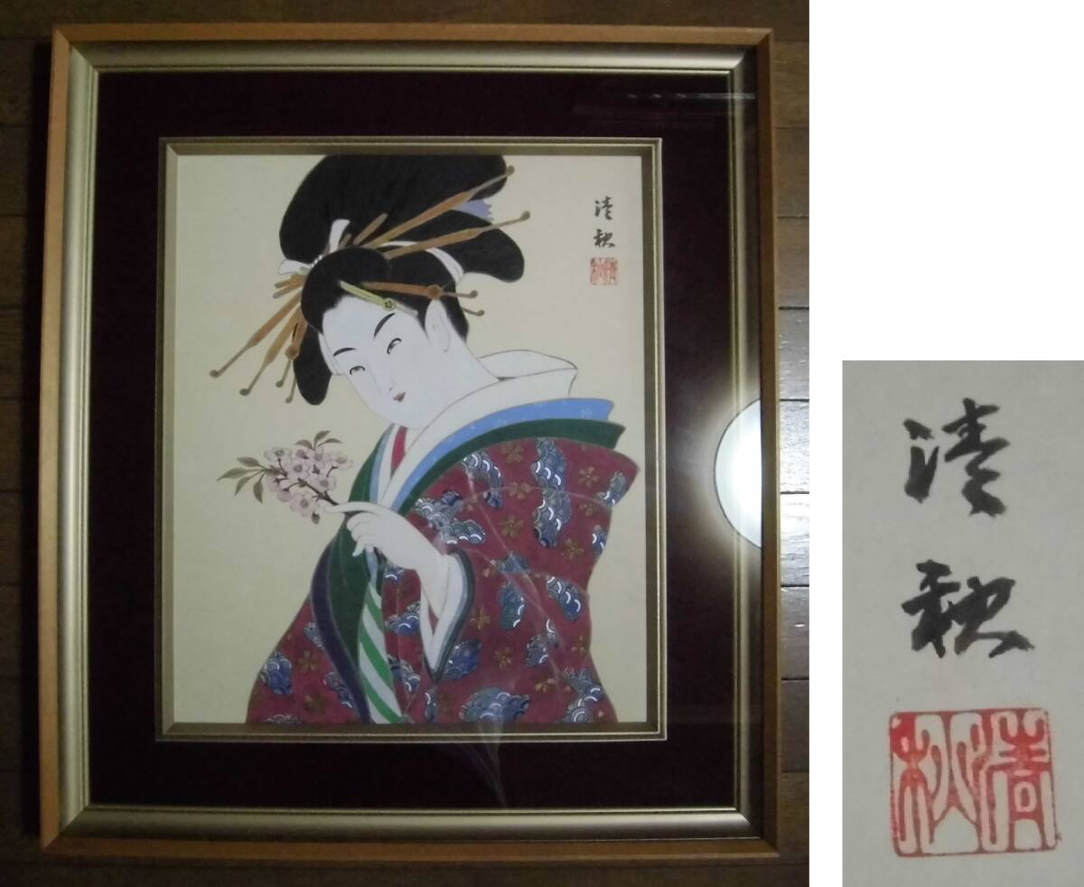 > 肉筆 紙本 清秋 印有り ガラス 木製額縁入り 美人画 浮世絵 日本画 壁掛け 飾り物 工芸品 レトロ 「真作」