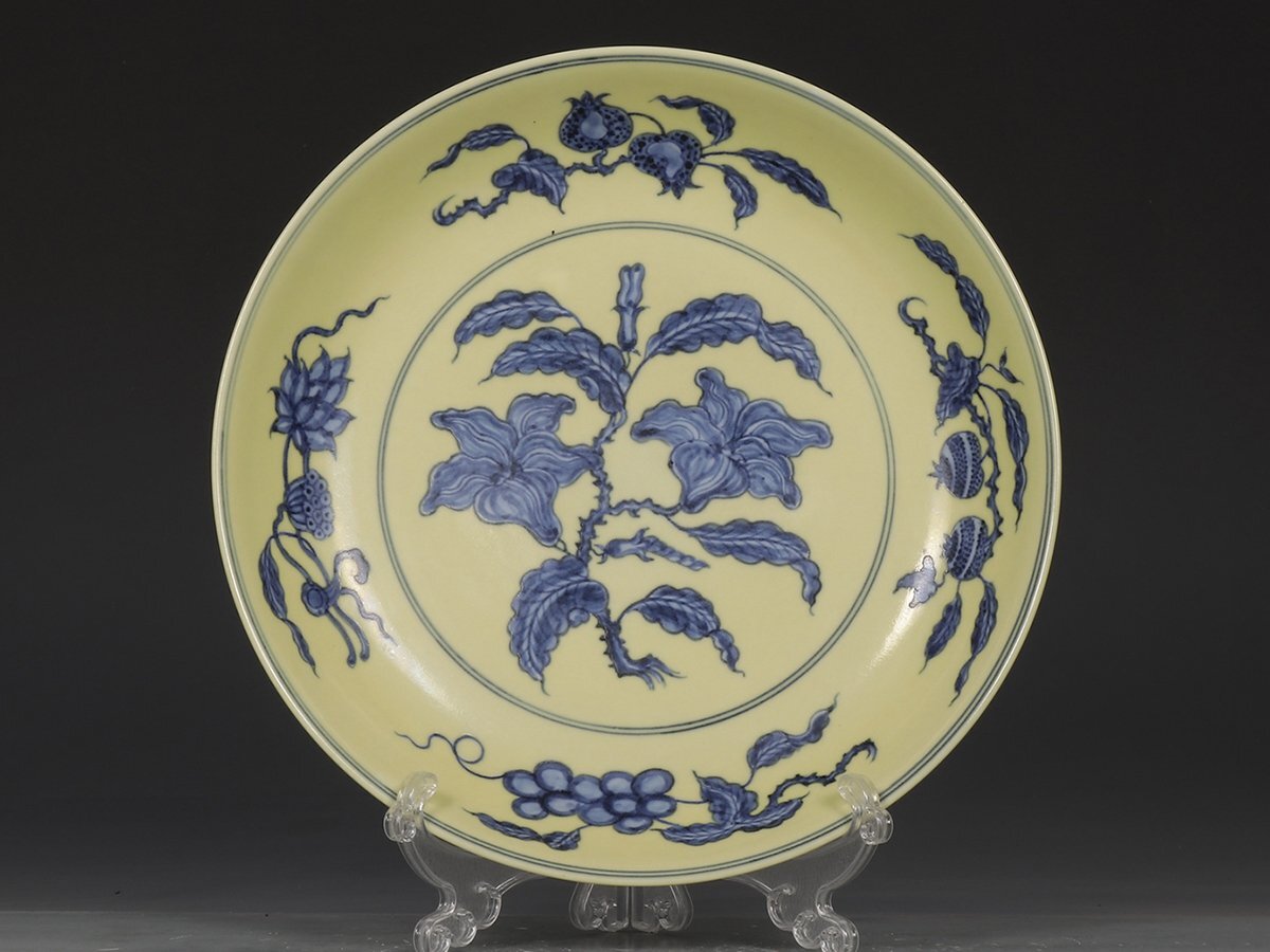 - 【安】明時代 大明成化年製 黄地青花纏枝花果紋盤 共箱 唐瓷 染付 古陶瓷 中国古美術 古董品 260