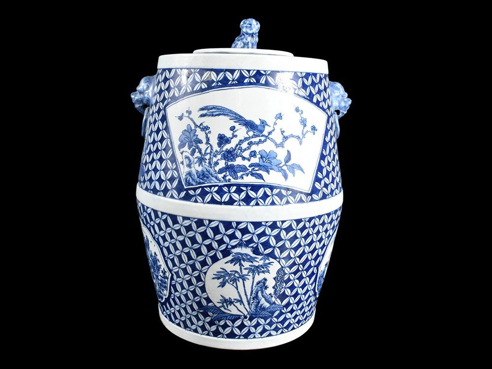 > 【雲】某資産家買取品 中国古玩 染付花鳥楼閣山水文獅子摘み蓋付壺 高さ40cm 古美術品(花瓶花器花入)CJ1530 DTbfhd