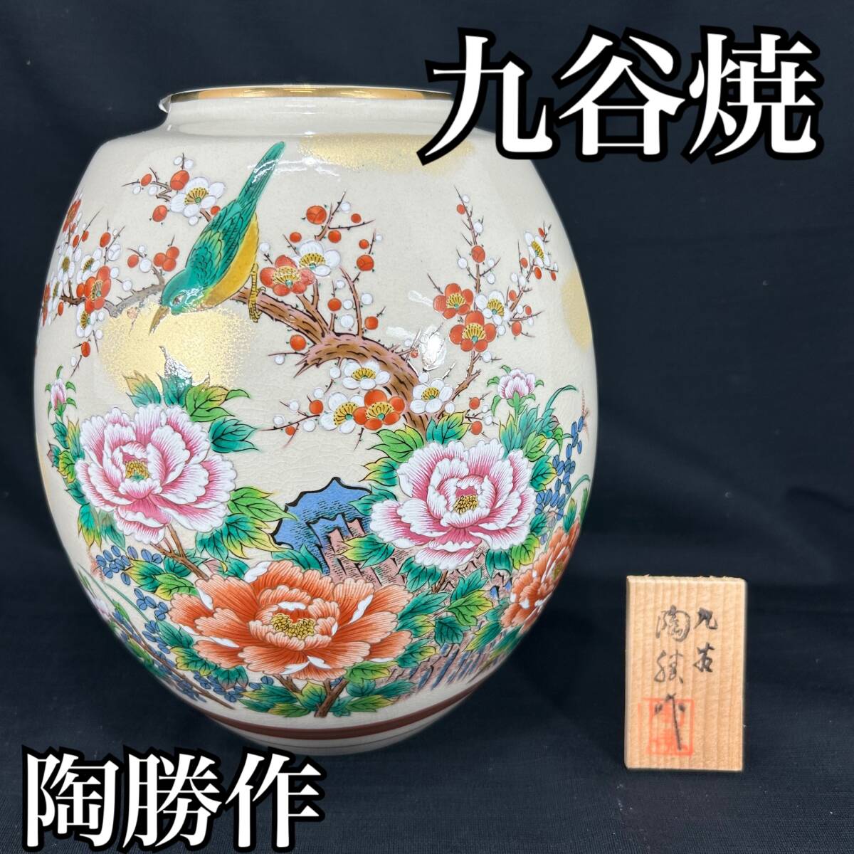 > 【未使用】九谷焼 陶勝作 花瓶 花鳥 牡丹 金彩色絵 高さ:約26.5cm 和風 インテリア 花器 壺 (E285)