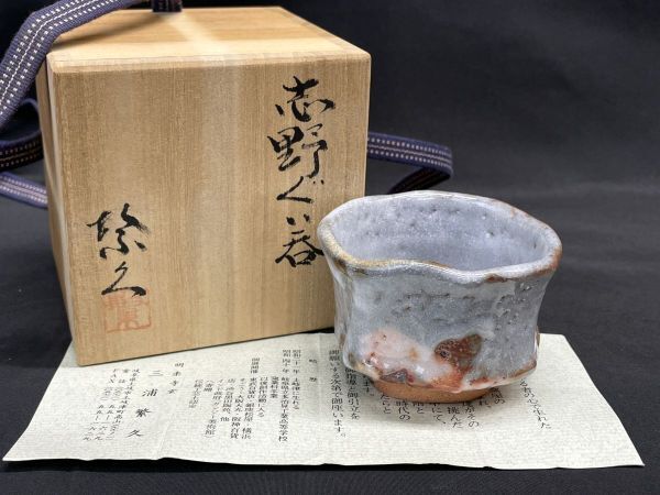 > 【K455】三浦繁久 志野 ぐい呑 共箱 共布 栞 本物保証 焼物 高級酒器 木箱 在銘 落款 b