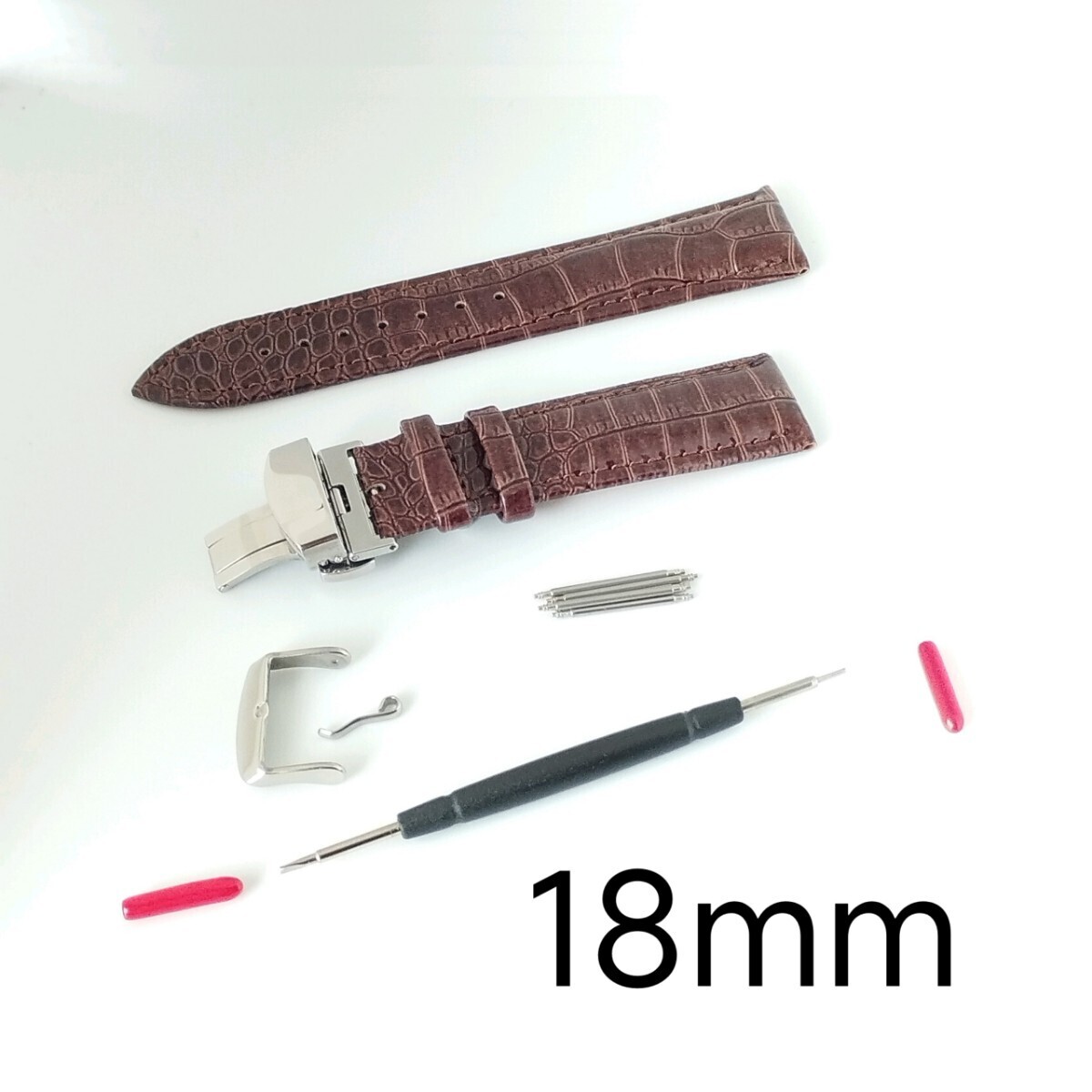 - 18mm 本革 腕時計 レザーベルト 交換ベルト バンド プッシュ式 Dバックル付き バネ棒 バネ棒外し付き クロコ ブラウン B16