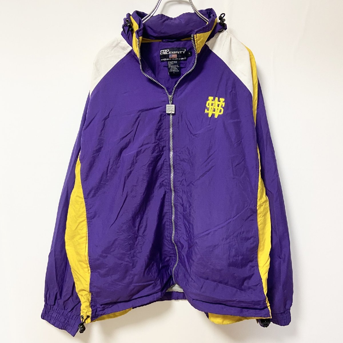 - 古着 used PRO CELEBRITY 長袖ジップアップナイロンジャケット ワンポイント刺繍 フード収納 紫 黄色 ?サイズ