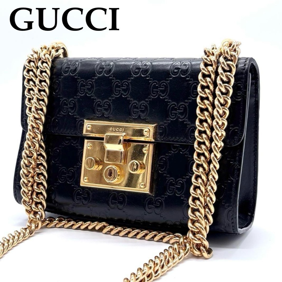 - 美品 GUCCI グッチ ショルダーバッグ パドロック シマ チェーン GG柄 バック 鞄 カバン レザー ブラック 黒 レディース