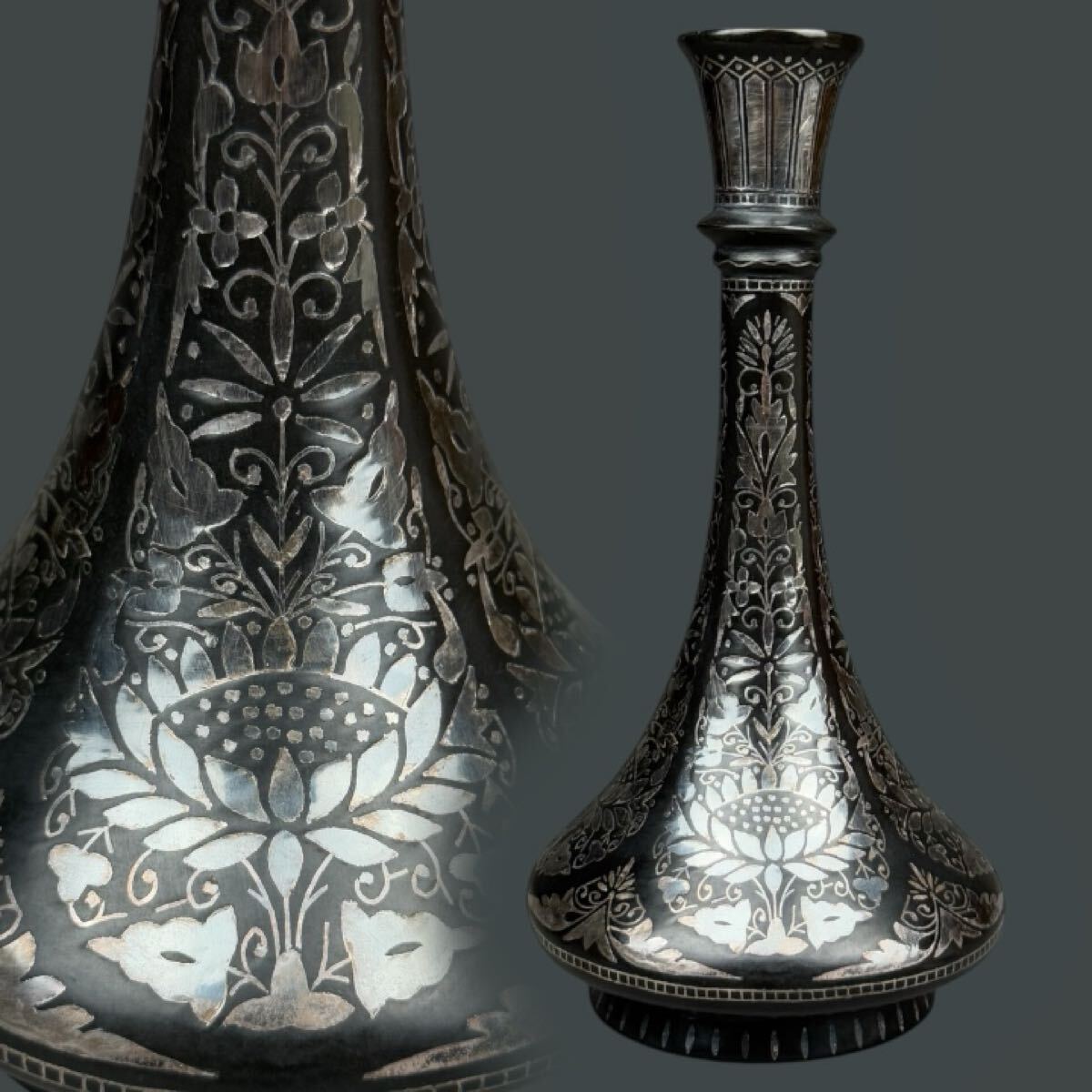 > 朝鮮美術 李朝 銀象嵌 銅花瓶 古銅 花瓶 銅瓶 花器 高さ22㎝ 816g 飾壺 時代品 李王家 銀細工 水瓶 朝鮮唐物骨董 ①