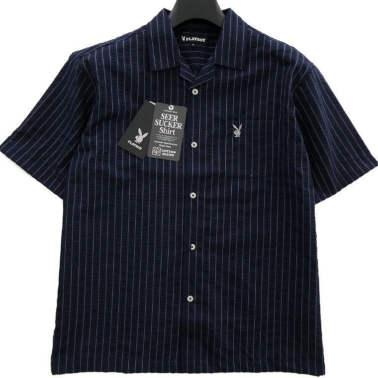 - 新品 プレイボーイ 25年春夏 開襟 シアサッカー 半袖 シャツ L 紺 【PB252034_79_L】 PLAYBOY ロゴ 刺繍 オープンカラー ストライプ