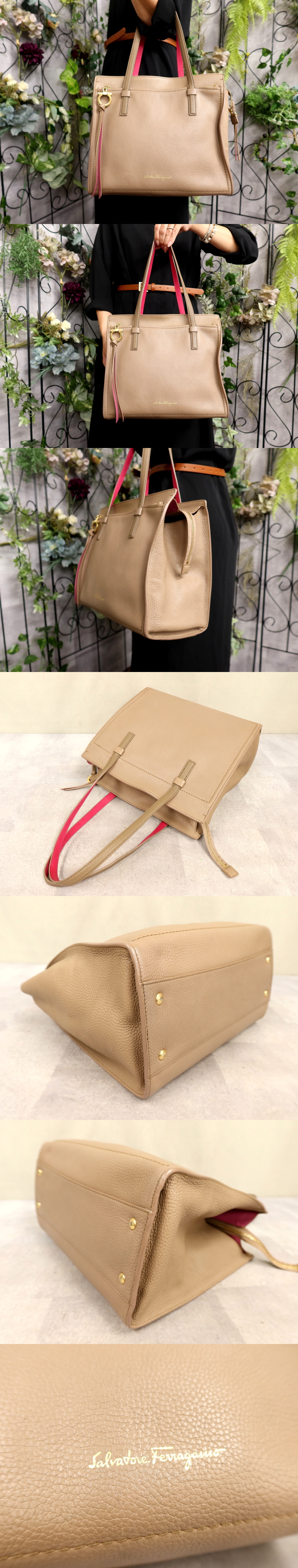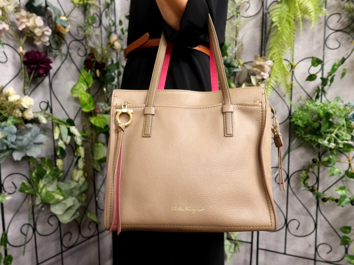 > ●超美品●フェラガモ●エイミー●ガンチーニ●カーフ レザー 本革●トート バッグ●ベージュ ピンク●G金具●腕掛け●B5 かばん●Js60642