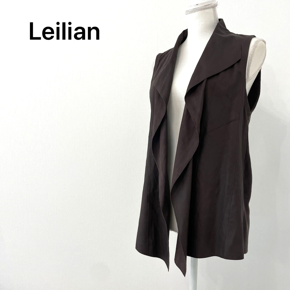 > 【762】 Leilian レリアン 切替レザーベスト ノースリーブ ブラウン やぎ革 ゴートレザー 日本製 表記サイズ9 レディースМ相当 伸縮性有り
