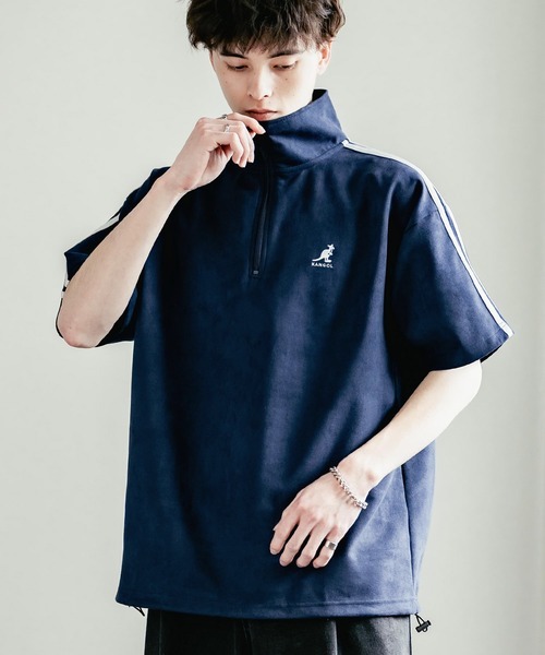 - 新品♪KANGOL≪カンゴール≫ オーバーサイズカットスエードワンポイントロゴ刺繍袖ライン半袖ハーフジップ メンズ♪Lサイズ♪ネイビー♪