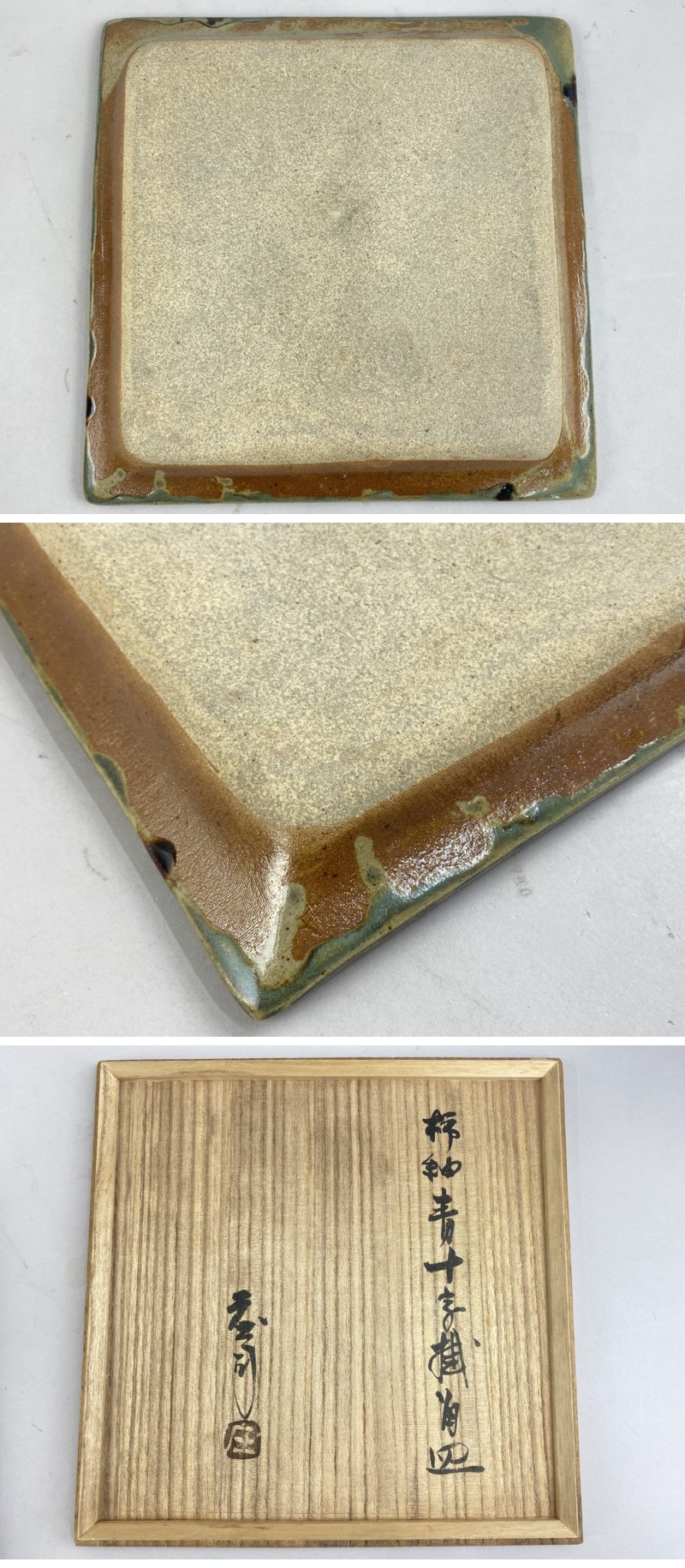 - ac439 人間国宝 濱田庄司 益子焼 柿釉 青十字掛 角皿 直径26.5cm 四方皿 大皿 民藝 飾皿 共箱
