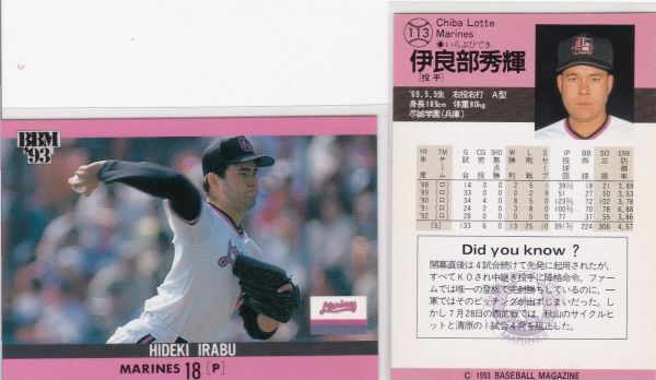 - ●1993BBM 【伊良部 秀輝】 BASEBALL CARD No.113:ロッテ R4