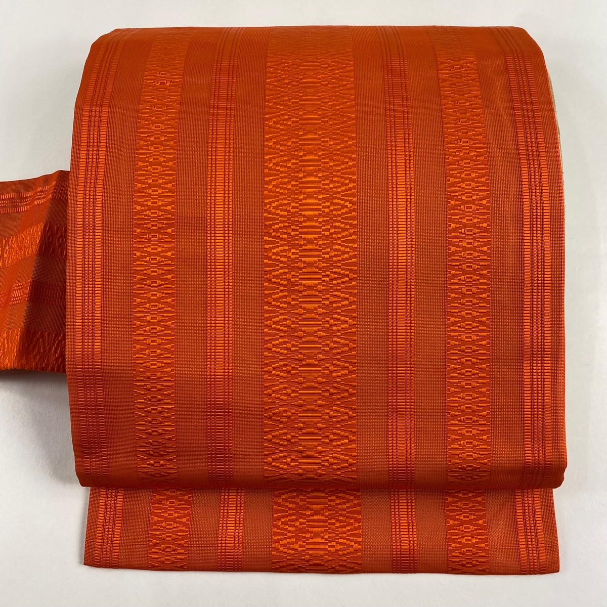 - 名古屋帯 美品 優品 夏帯 縞 幾何学模様 朱色 正絹 【中古】