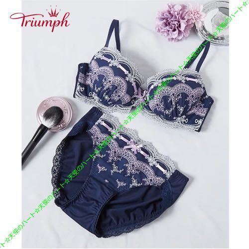 - 【送料無料】新品 トリンプ かわいいリボンの3/4カップブラ&ショーツ E75-L ネイビー×ラベンダー