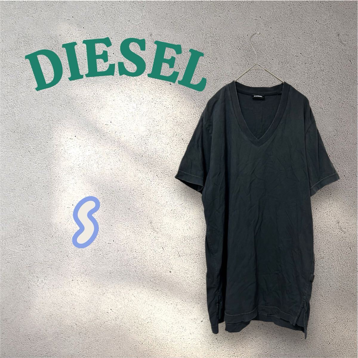 - DIESEL ディーゼル 無地 ブラック Vネック ロング丈 Tシャツ S